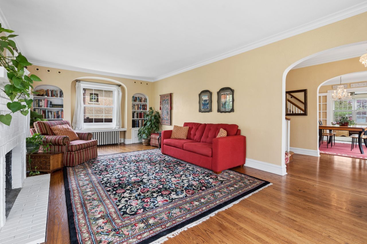 Some homes simply feel special the moment you step inside, and this classic red brick Edison Park charmer is one of them! Perfectly positioned on an oversized, beautifully landscaped corner lot, this center-entrance Colonial offers timeless elegance, exceptional natural light, and an unbeatable walk-to-everything location. Just steps to Ebinger Elementary, St. Juliana, the Metra, new EP Market, and all the beloved dining, shopping, and neighborhood favorites along Northwest Highway! The sun-filled living room is truly unforgettable, featuring striking double door-style windows flanking a gas fireplace, each adorned with charming wrought iron detail. These architectural features are rarely found and create incredible natural light, a wonderful cross breeze, and a warm, inviting atmosphere throughout the day. With its ideal south-facing exposure, sunlight pours into the home from morning through evening! Rich in character, the home showcases beautiful vintage details and hardwood floors throughout, including original built-ins in the living room and dining room that provide both function and charm. The layout offers a full formal dining room, a charming kitchen with a cozy breakfast nook, and a bright, versatile sunroom perfect for a home office, reading room, or play space. All four true bedrooms are located on the second level, providing a highly desirable and uncommon layout. Radiator heat combined with SpacePak central air delivers the perfect balance of comfort and efficiency. The unfinished basement includes overhead sewers and an ejector pump and presents an excellent opportunity for future expansion or additional storage. Outside, the spacious yard, patio, and professional landscaping create an ideal setting for relaxing or entertaining. A two-car detached garage completes the package. A rare opportunity to own a truly special home filled with character, charm, and warmth in one of Edison Park's most sought-after locations!